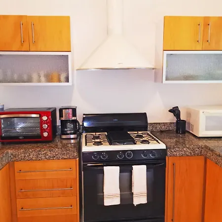 Eine komplette Küche mit einem Kühlschrank, einem Herd und Küchenutensilien gehört zur Ausstattung dieses Apartments für Selbstversorger. Die Bushaltestelle Colectivo pick up befindet sich gleich neben dem Las Olas Condo Carmen entfernt.